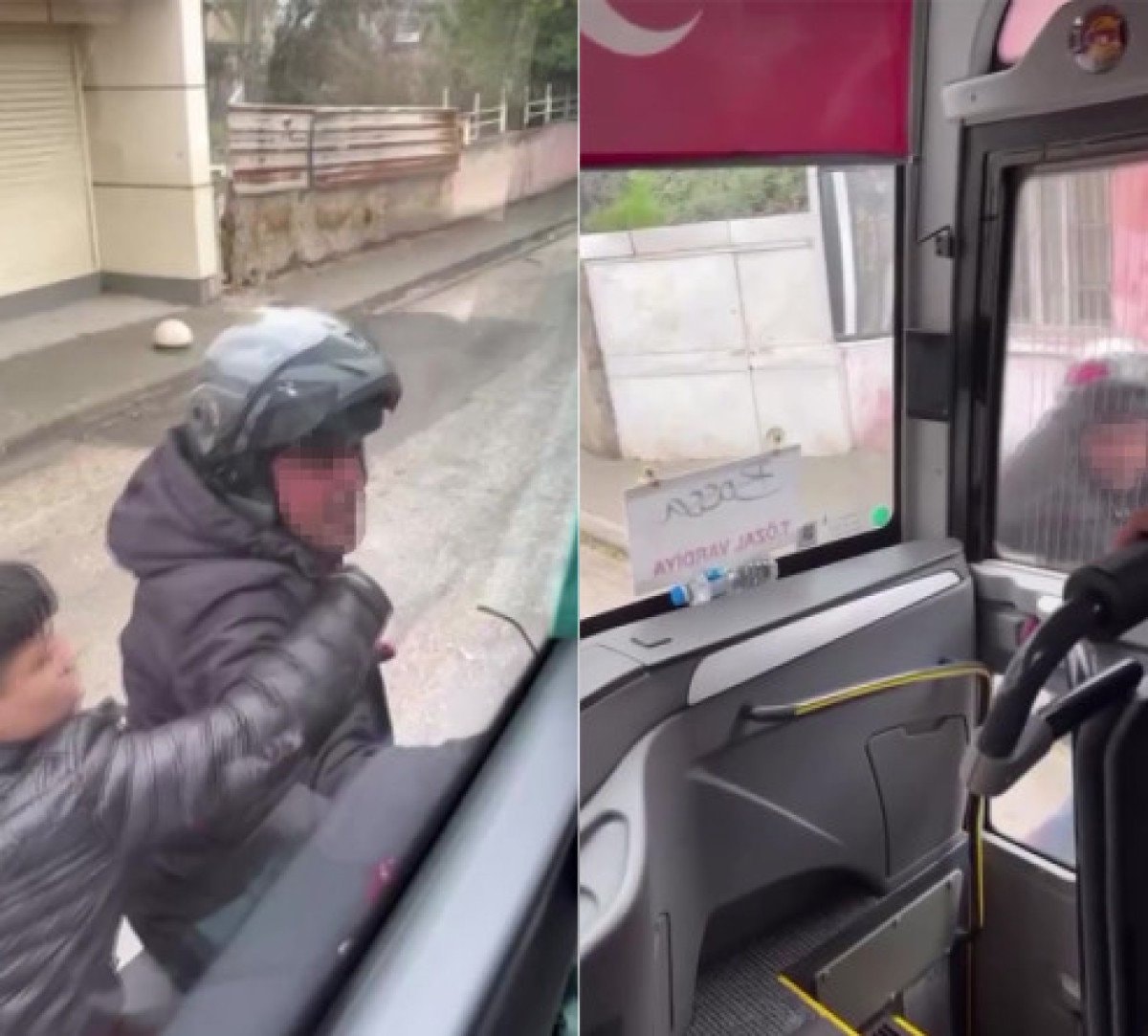 Bu sırada motosiklet sürücüsü önce servis şoförüne tepki gösterdi ardından da kaskıyla servisin kapısının camını kırdı.