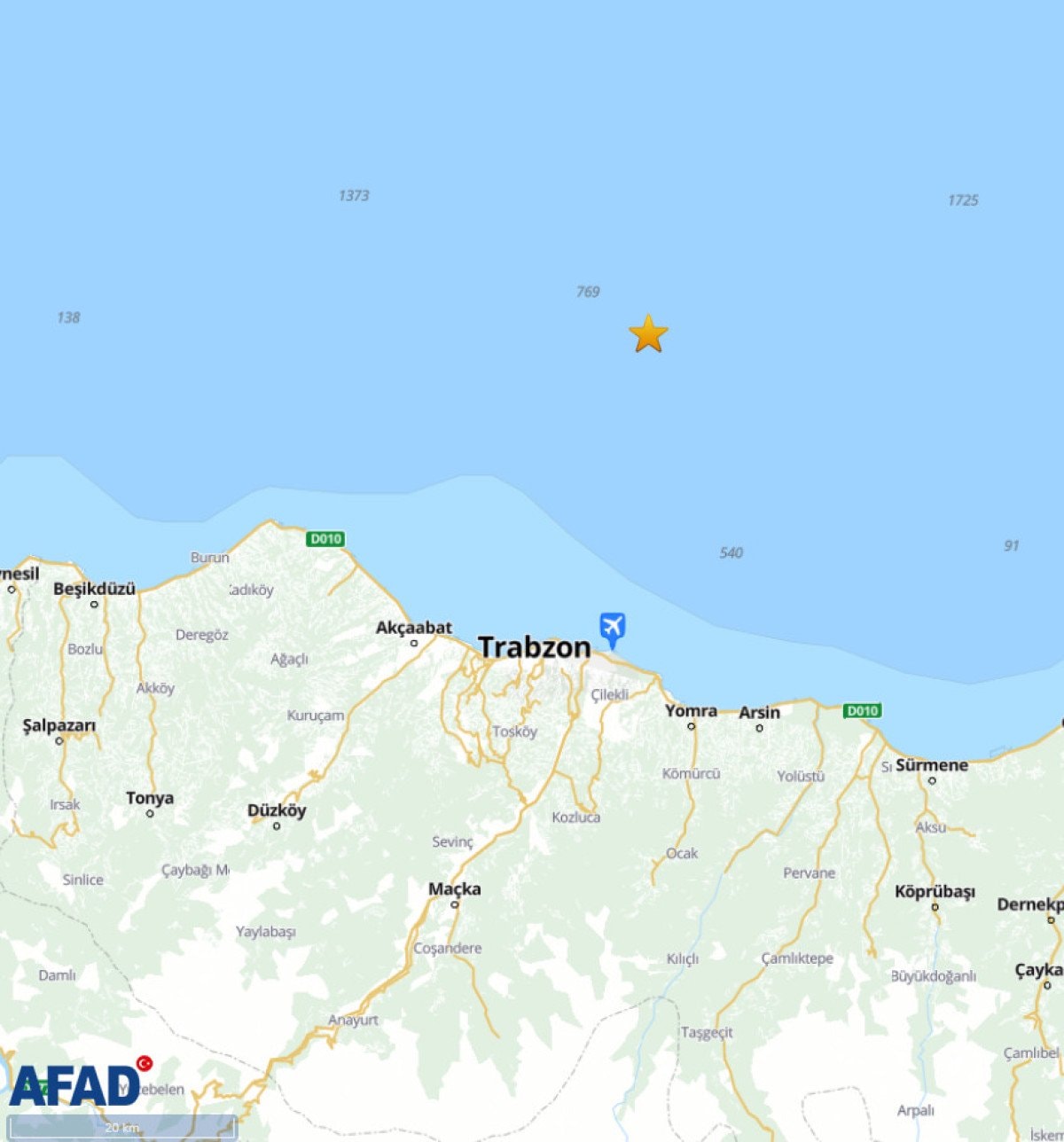 Afet ve Acil Durum Yönetimi Başkanlığı (AFAD) verilerine göre, saat 23.15’te Trabzon’un Karadeniz açıklarında 3.8 büyüklüğünde deprem oldu.
